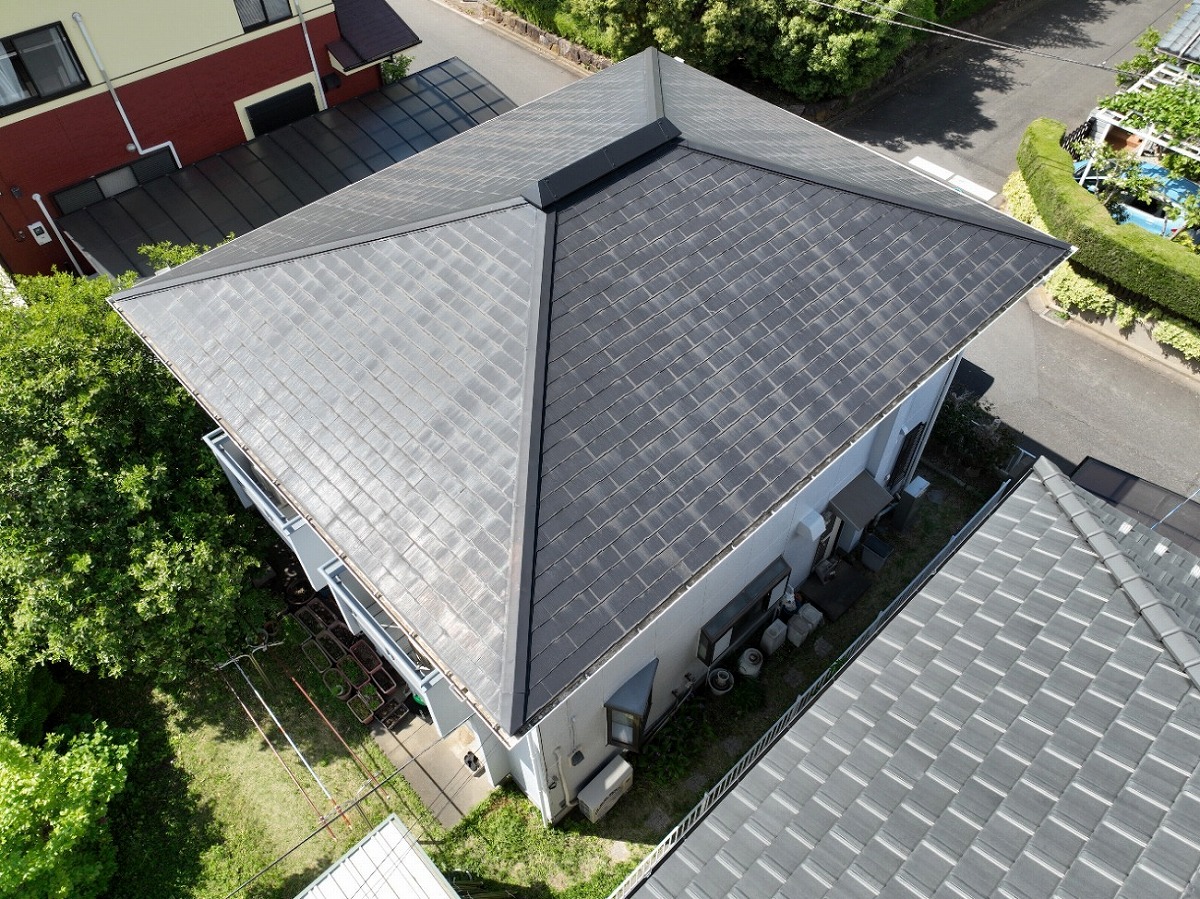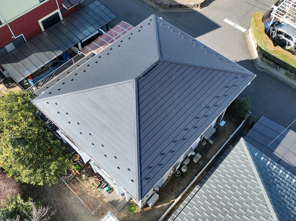 施工後 屋根葺き替えのドローン上空写真
