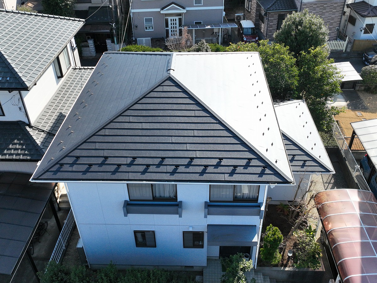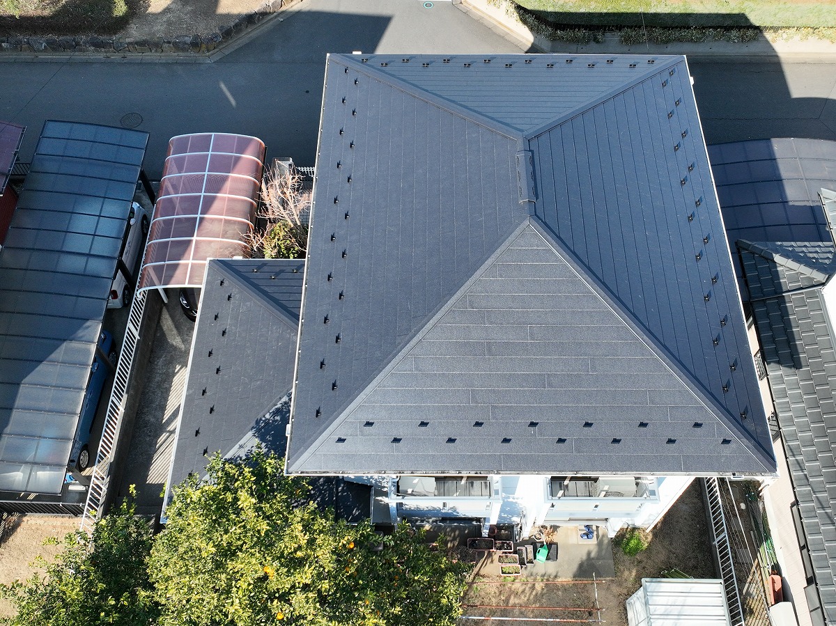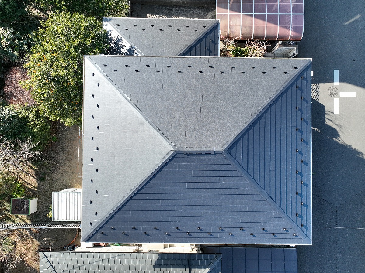 施工後 屋根葺き替えのドローン上空写真